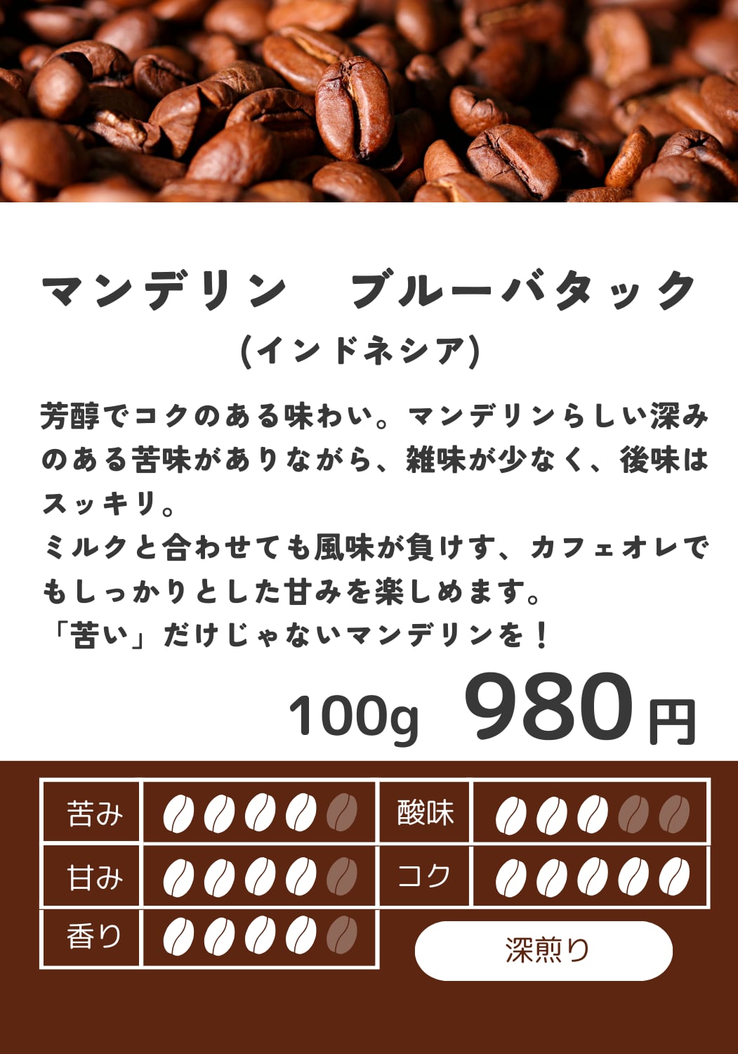 マンデリンらしい深みのある苦味とコクがありながら、雑味が少なく、後味はすっきり。